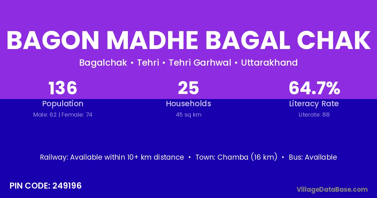 Bagon Madhe Bagal Chak village has a total population of 136 people, of which 62 are males and 74 are females.