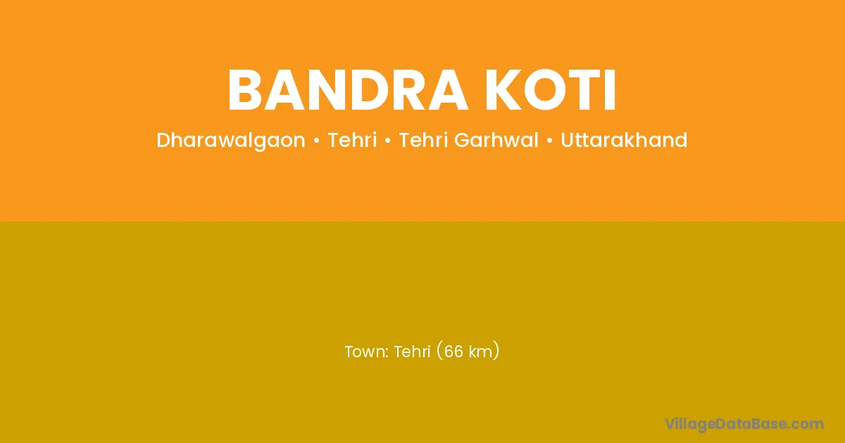 Tehri (66 km) is the nearest town to Bandra Koti village for major economic activities and is located approximately 66 km away.
