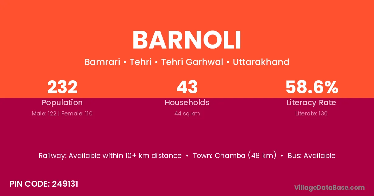 Chamba (48 km) is the nearest town to Barnoli village for major economic activities and is located approximately 48 km away.