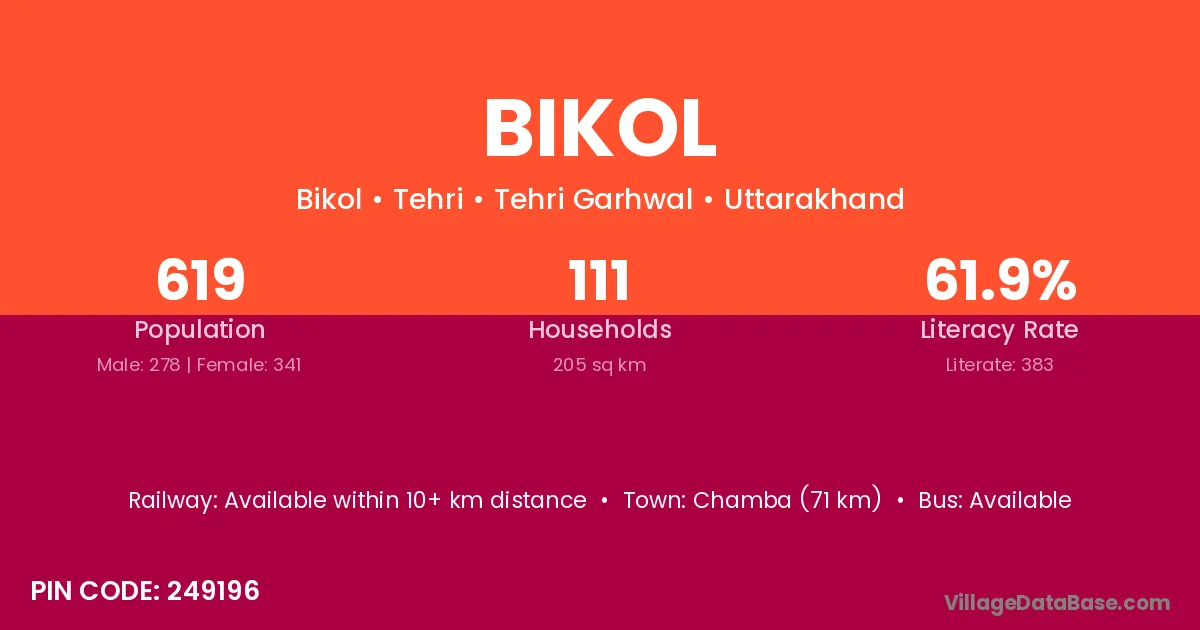 Chamba (71 km) is the nearest town to Bikol village for major economic activities and is located approximately 71 km away.