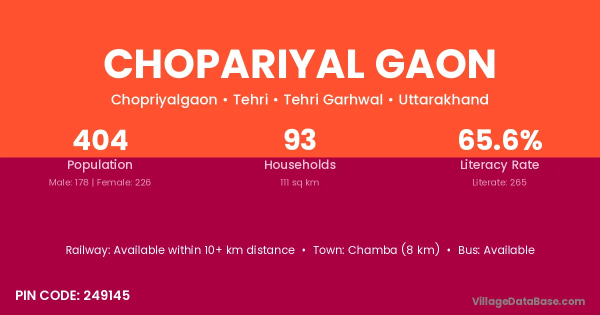 Chamba (8 km) is the nearest town to Chopariyal Gaon village for major economic activities and is located approximately 8 km away.