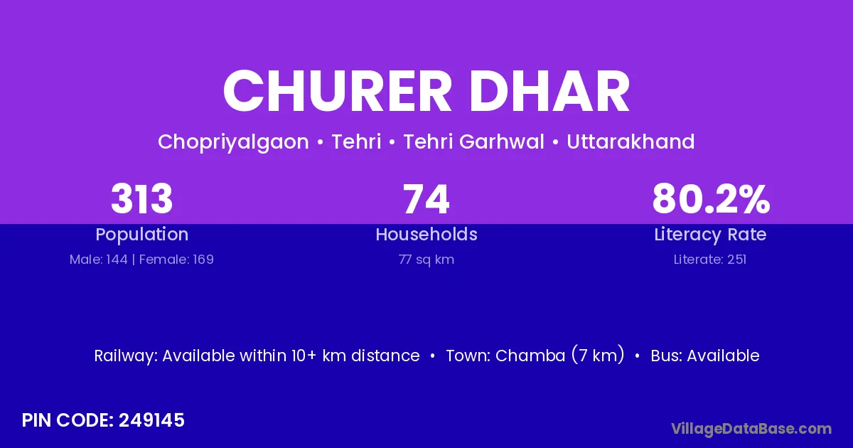 Chamba (7 km) is the nearest town to Churer Dhar village for major economic activities and is located approximately 7 km away.