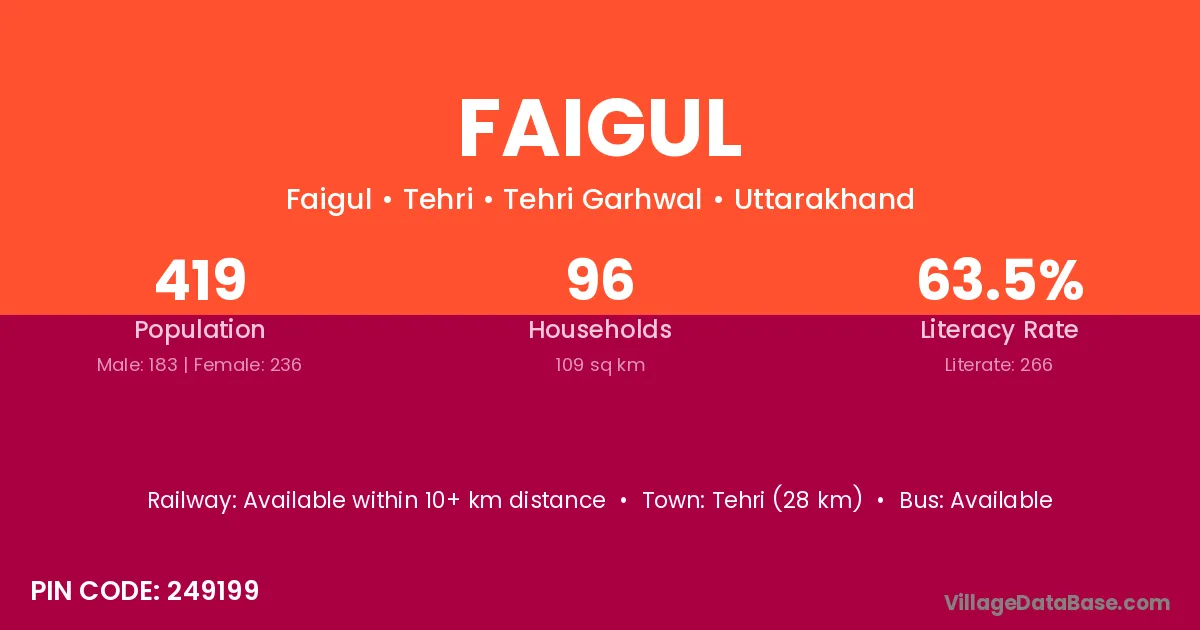 Tehri (28 km) is the nearest town to Faigul village for major economic activities and is located approximately 28 km away.