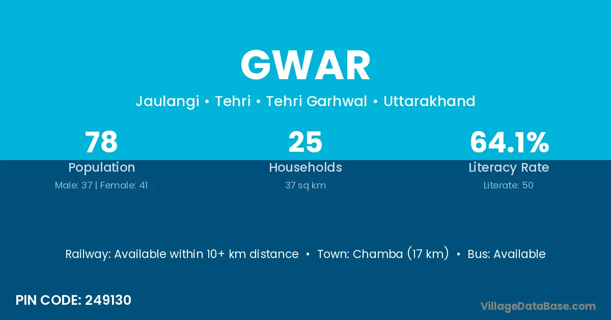 Chamba (17 km) is the nearest town to Gwar village for major economic activities and is located approximately 17 km away.
