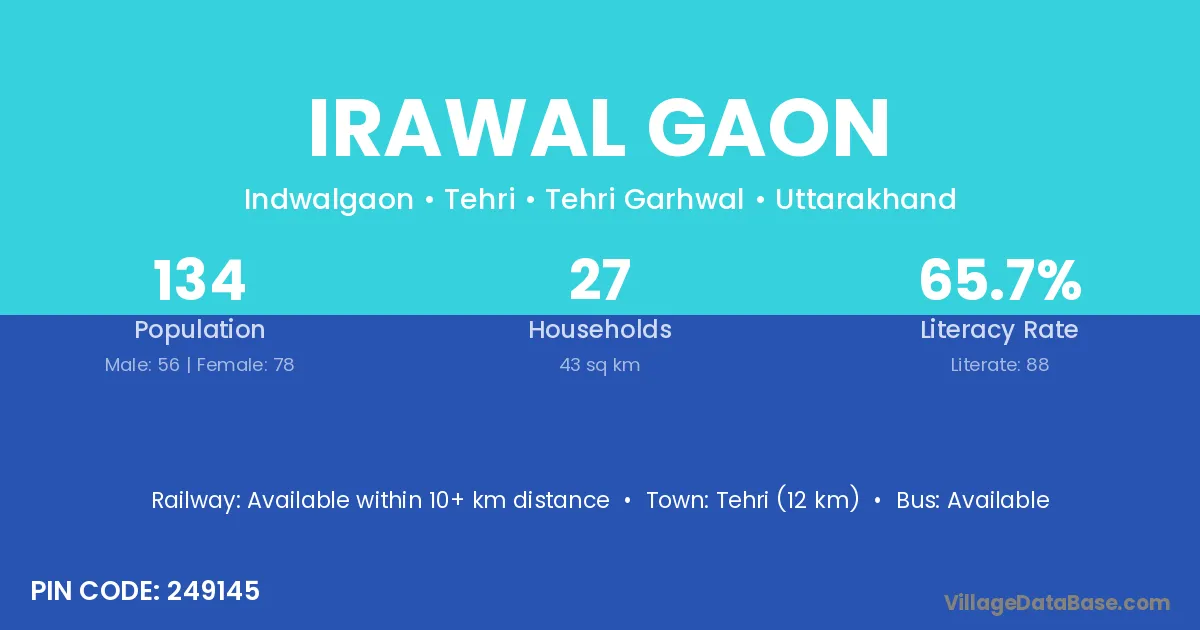 Tehri (12 km) is the nearest town to Irawal Gaon village for major economic activities and is located approximately 12 km away.