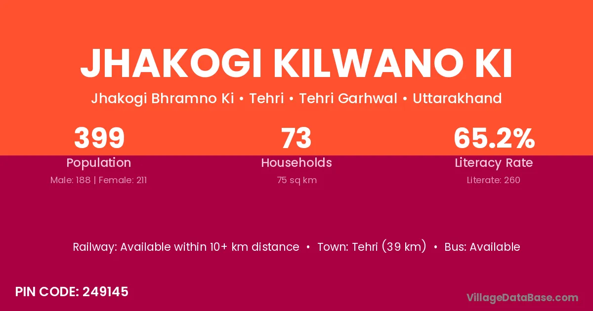 Tehri (39 km) is the nearest town to Jhakogi Kilwano Ki village for major economic activities and is located approximately 39 km away.
