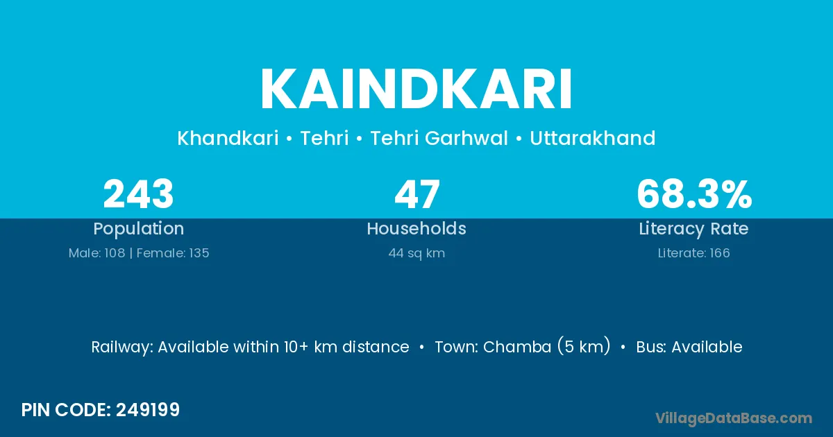 Chamba (5 km) is the nearest town to Kaindkari village for major economic activities and is located approximately 5 km away.