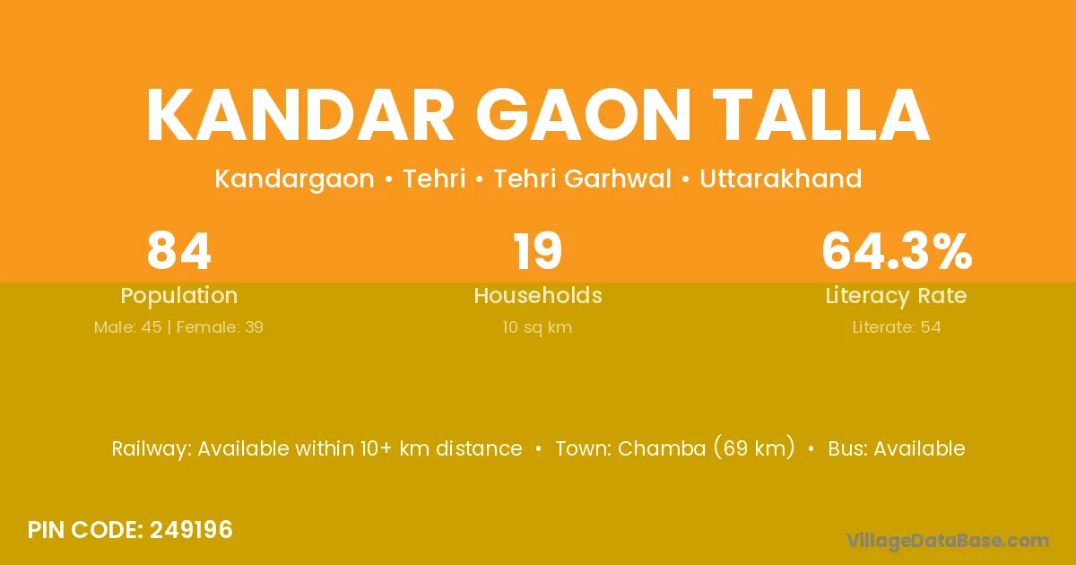 Kandar Gaon Talla village has a total population of 84 people, of which 45 are males and 39 are females.