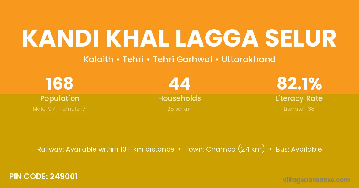 Kandi Khal Lagga Selur village has a total population of 168 people, of which 97 are males and 71 are females.