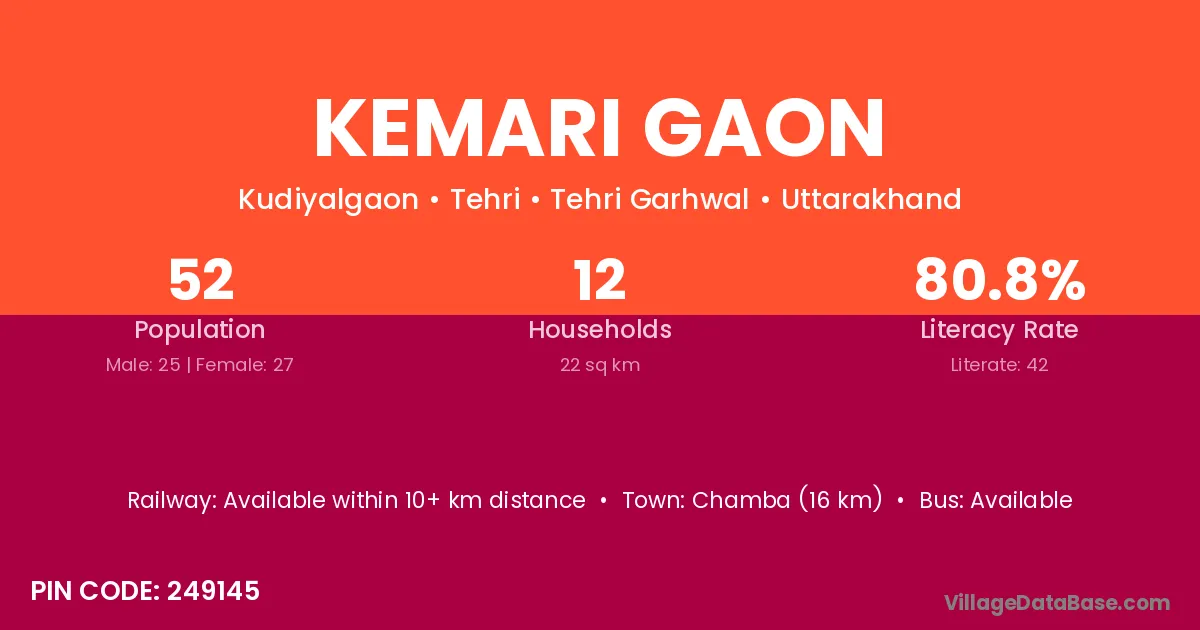 Chamba (16 km) is the nearest town to Kemari Gaon village for major economic activities and is located approximately 16 km away.