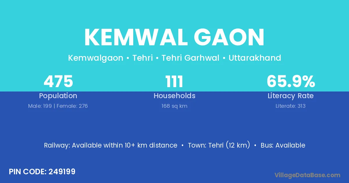Tehri (12 km) is the nearest town to Kemwal Gaon village for major economic activities and is located approximately 12 km away.
