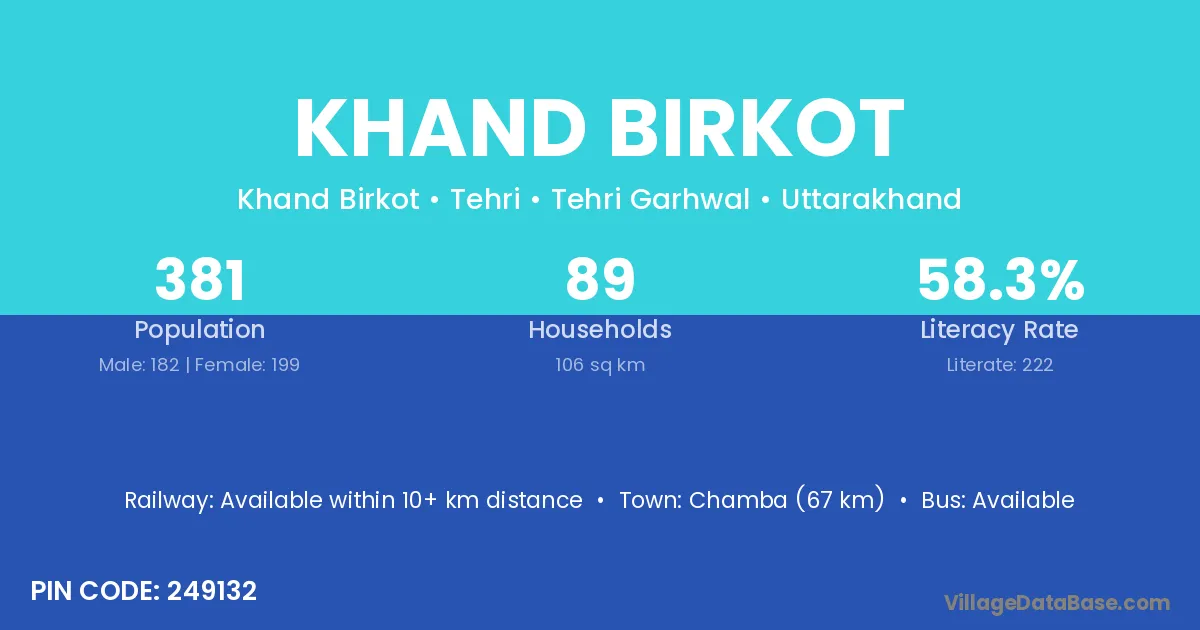 Chamba (67 km) is the nearest town to Khand Birkot village for major economic activities and is located approximately 67 km away.