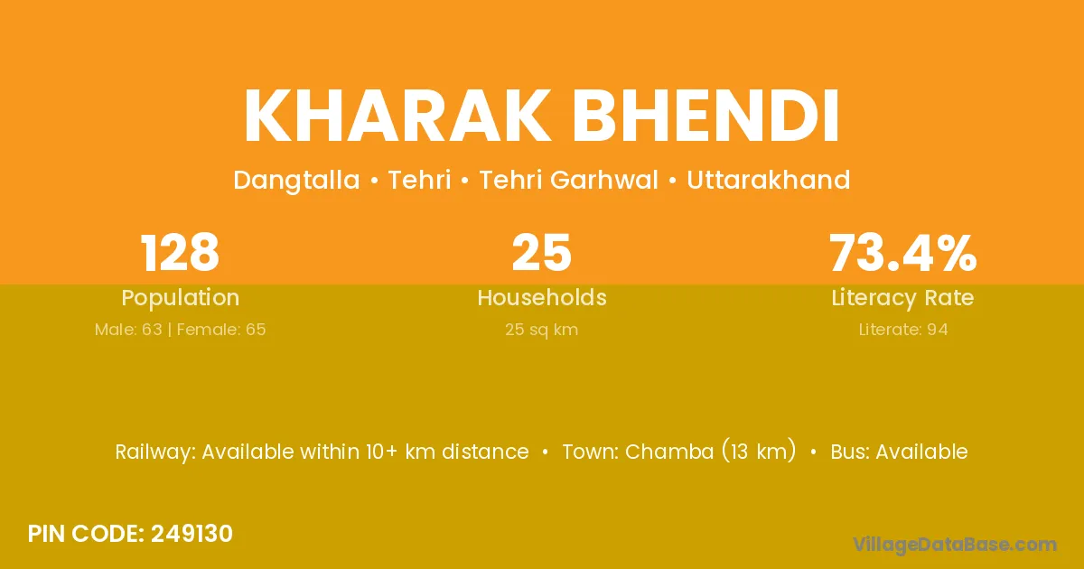 Chamba (13 km) is the nearest town to Kharak Bhendi village for major economic activities and is located approximately 13 km away.