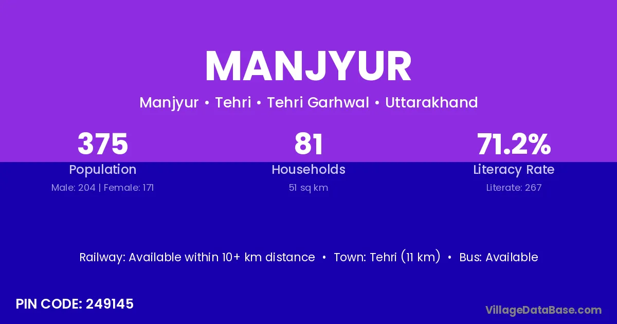 Tehri (11 km) is the nearest town to Manjyur village for major economic activities and is located approximately 11 km away.