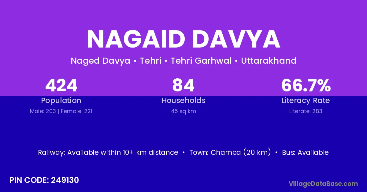 Chamba (20 km) is the nearest town to Nagaid Davya village for major economic activities and is located approximately 20 km away.