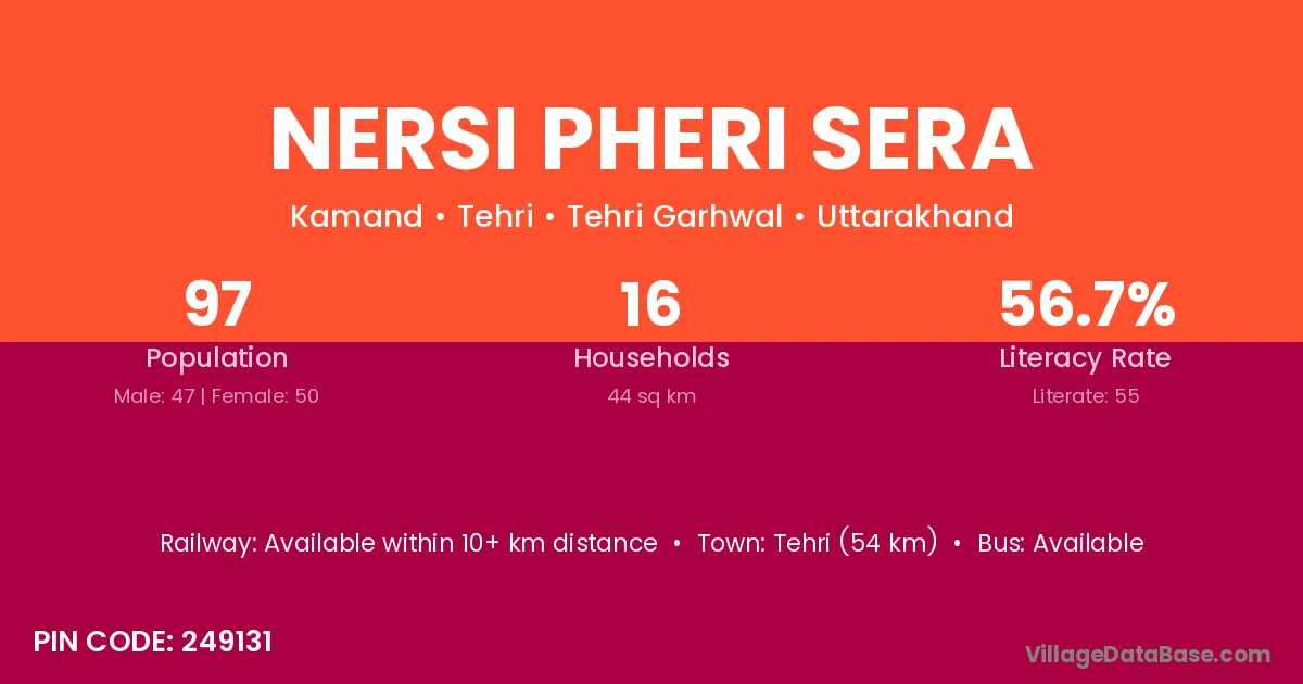 Tehri (54 km) is the nearest town to Nersi Pheri Sera village for major economic activities and is located approximately 54 km away.