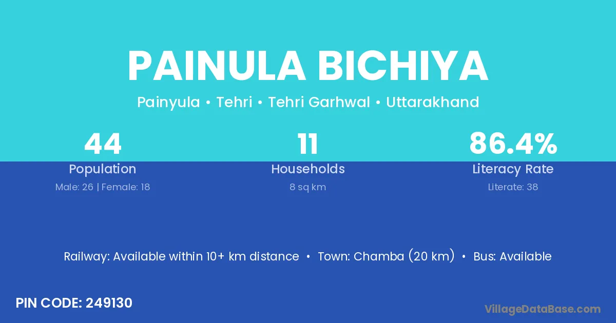 Chamba (20 km) is the nearest town to Painula Bichiya village for major economic activities and is located approximately 20 km away.