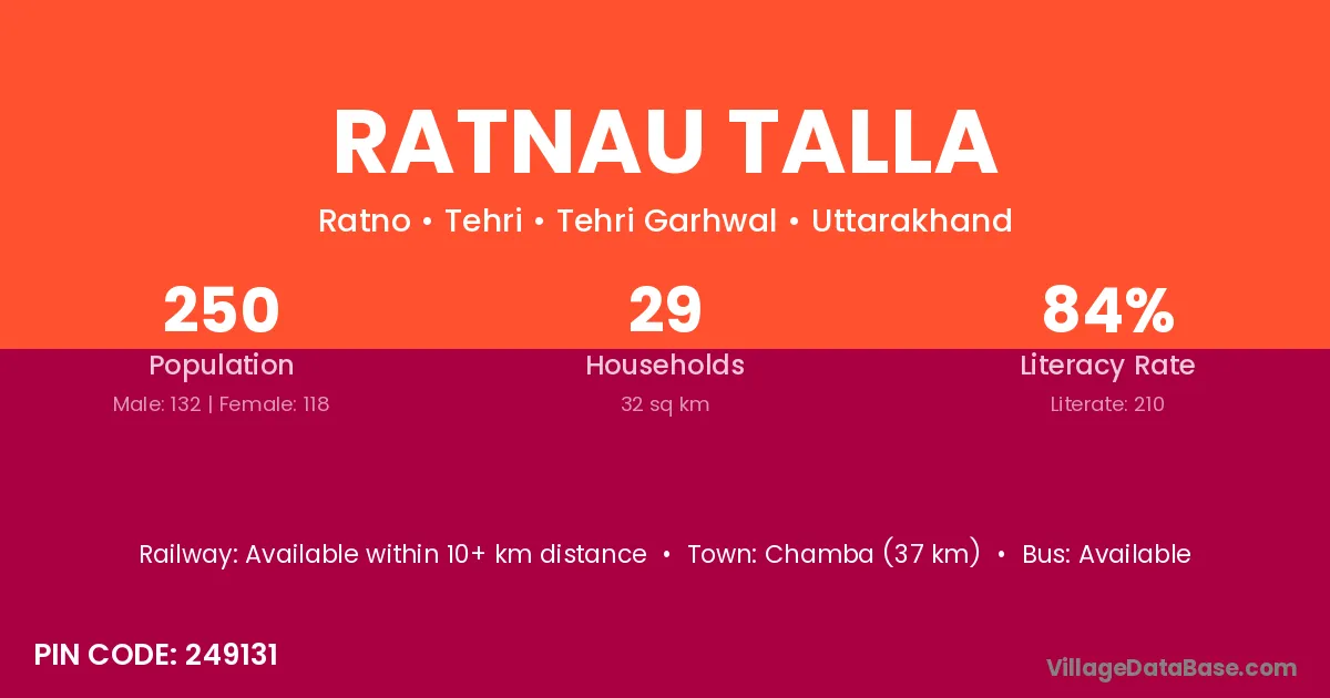 Chamba (37 km) is the nearest town to Ratnau Talla village for major economic activities and is located approximately 37 km away.