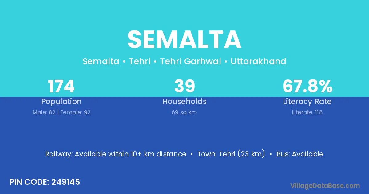 Tehri (23 km) is the nearest town to Semalta village for major economic activities and is located approximately 23 km away.