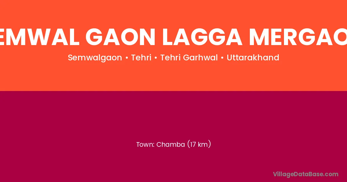 Chamba (17 km) is the nearest town to Semwal Gaon Lagga Mergaon village for major economic activities and is located approximately 17 km away.