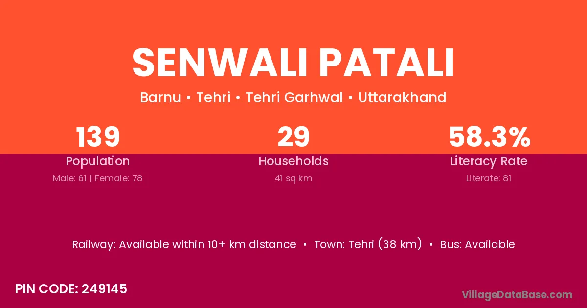 Tehri (38 km) is the nearest town to Senwali Patali village for major economic activities and is located approximately 38 km away.