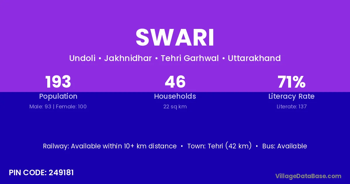 Chamba (24 km) is the nearest town to Swari village for major economic activities and is located approximately 24 km away.