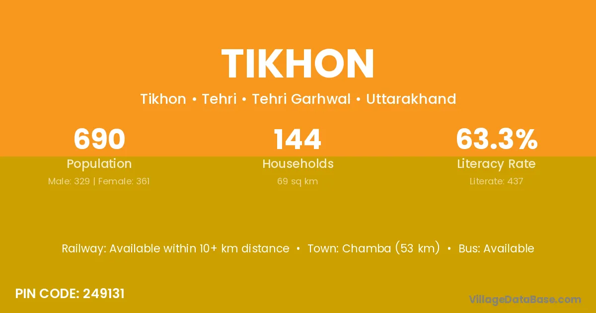Chamba (53 km) is the nearest town to Tikhon village for major economic activities and is located approximately 53 km away.