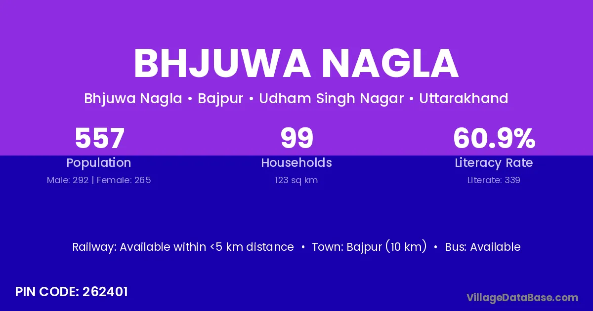 Bhjuwa Nagla village has a total population of 557 people, of which 292 are males and 265 are females.
