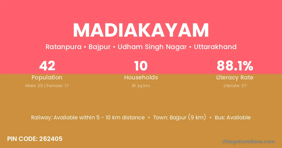 Madiakayam village has a total population of 42 people, of which 25 are males and 17 are females.