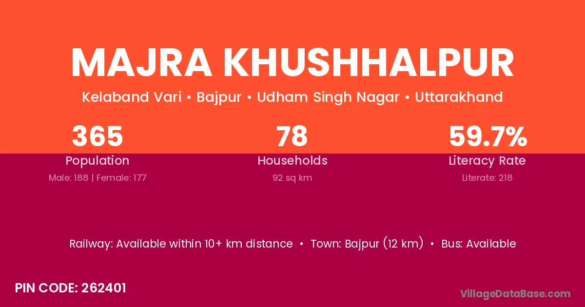 Bajpur (12 km) is the nearest town to Majra Khushhalpur village for major economic activities and is located approximately 12 km away.