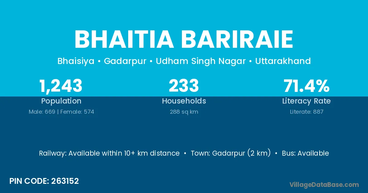 Gadarpur (2 km) is the nearest town to Bhaitia Bariraie village for major economic activities and is located approximately 2 km away.