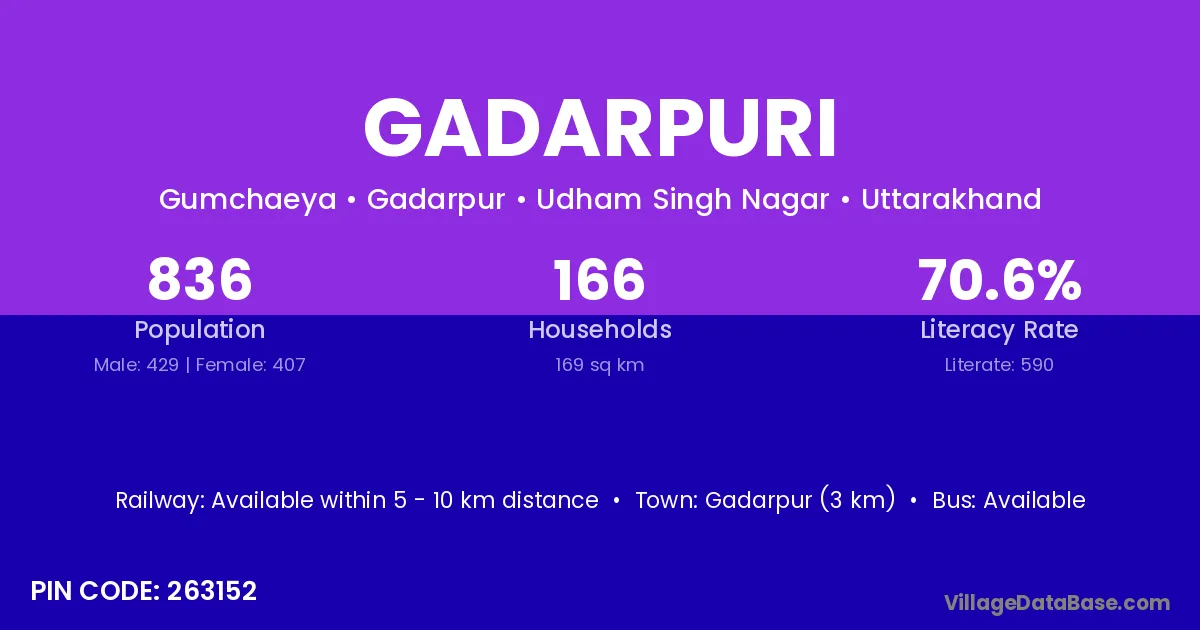 Gadarpur (3 km) is the nearest town to Gadarpuri village for major economic activities and is located approximately 3 km away.