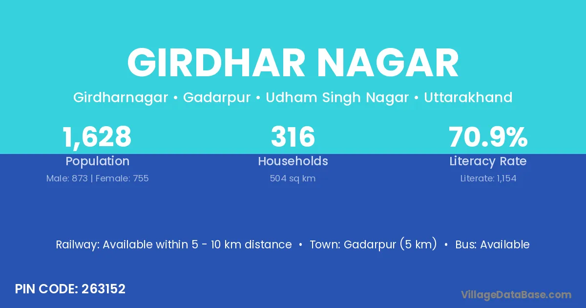 Gadarpur (5 km) is the nearest town to Girdhar Nagar village for major economic activities and is located approximately 5 km away.