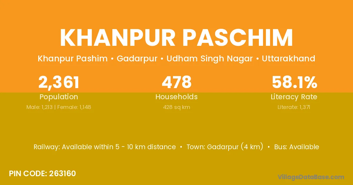 Gadarpur (4 km) is the nearest town to Khanpur Paschim village for major economic activities and is located approximately 4 km away.