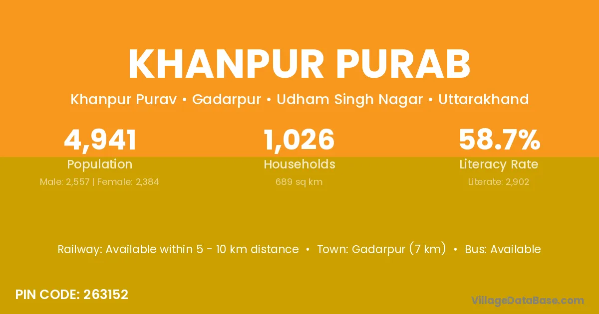 Gadarpur (7 km) is the nearest town to Khanpur Purab village for major economic activities and is located approximately 7 km away.