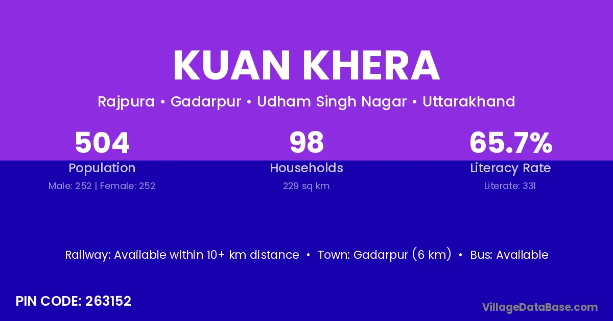 Gadarpur (6 km) is the nearest town to Kuan Khera village for major economic activities and is located approximately 6 km away.