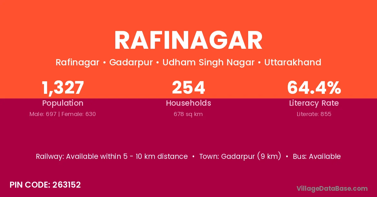 Gadarpur (9 km) is the nearest town to Rafinagar village for major economic activities and is located approximately 9 km away.