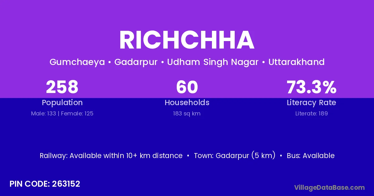 Gadarpur (5 km) is the nearest town to Richchha village for major economic activities and is located approximately 5 km away.