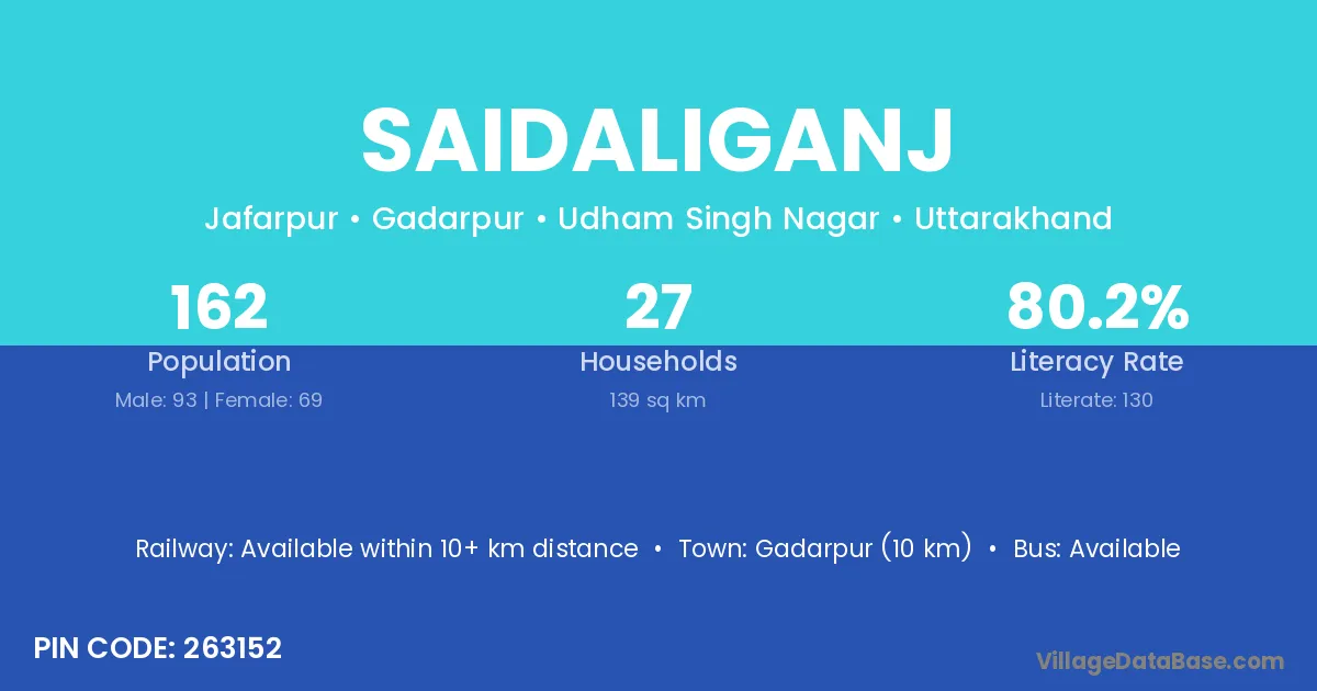 Gadarpur (10 km) is the nearest town to Saidaliganj village for major economic activities and is located approximately 10 km away.