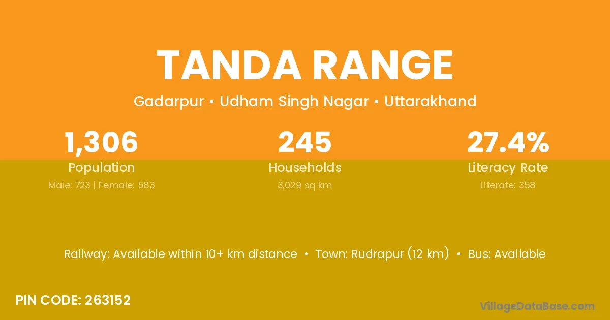 Rudrapur (12 km) is the nearest town to Tanda Range village for major economic activities and is located approximately 12 km away.