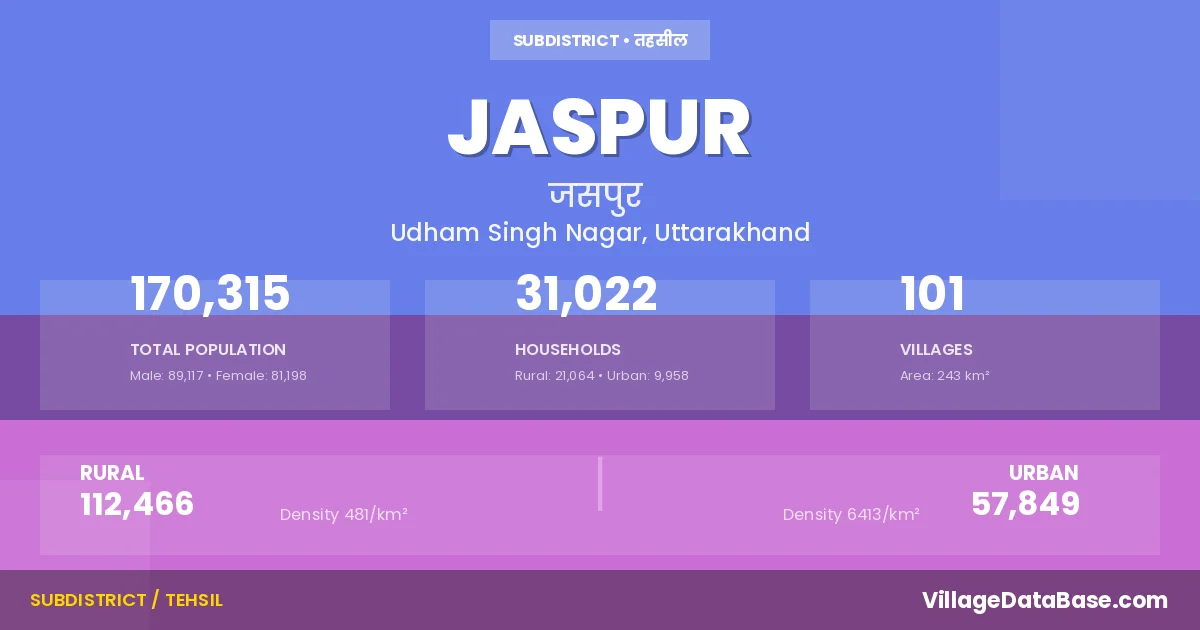 Jaspur is a town and Tehsil in the Udham Singh Nagar district of the Uttarakhand. In India, a Tehsil is a subdivision of a district responsible for the administration and revenue collection of a specific area within the district. Tehsils play a crucial role in the local governance structure, contributing significantly to the development and administration of their communities.
