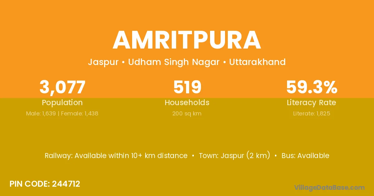 Jaspur (2 km) is the nearest town to Amritpura village for major economic activities and is located approximately 2 km away.