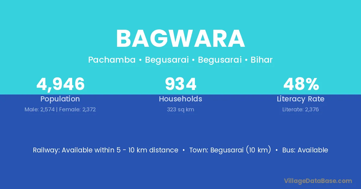 The literacy rate of Bagwara village is 73.15%. Male literacy stands at 75.94% and female literacy at 70.16%.