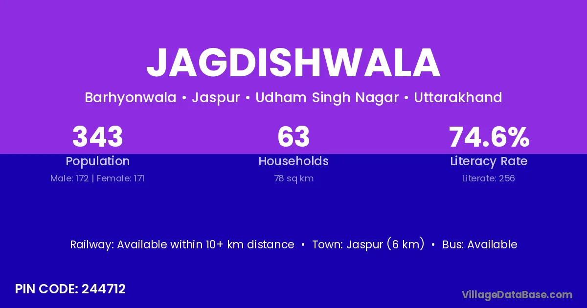 Jaspur (6 km) is the nearest town to Jagdishwala village for major economic activities and is located approximately 6 km away.