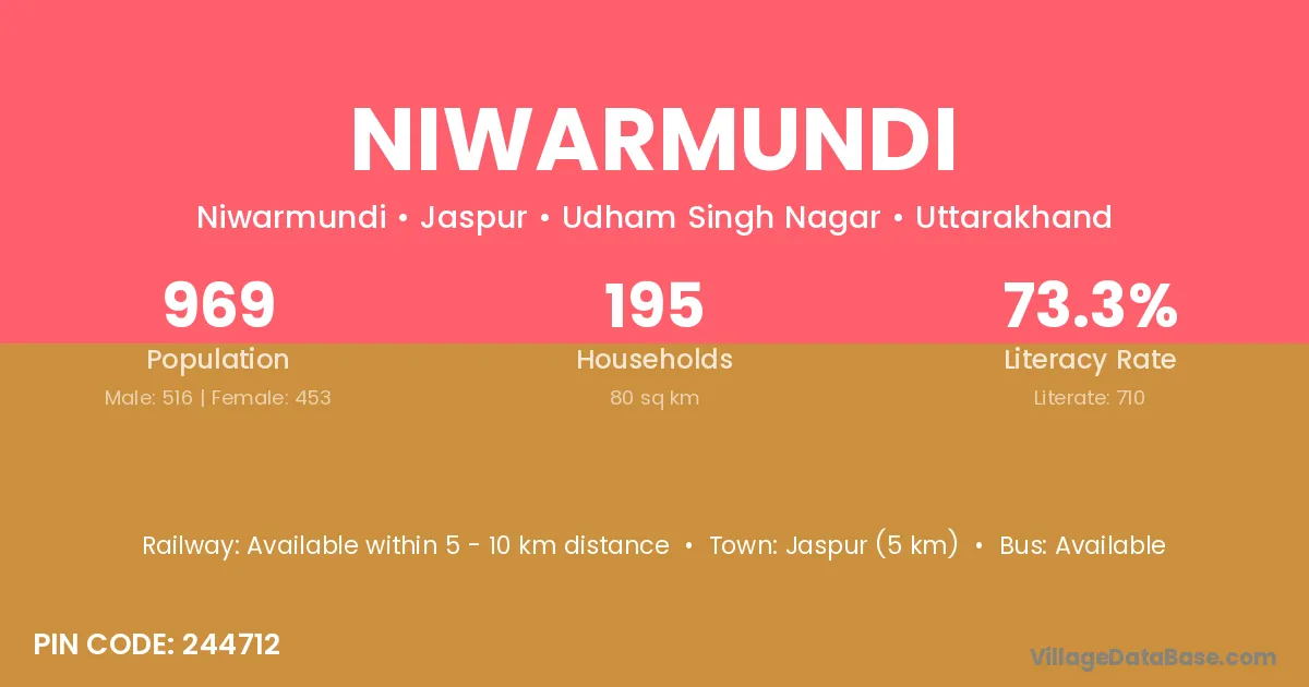Niwarmundi village has a total population of 969 people, of which 516 are males and 453 are females.