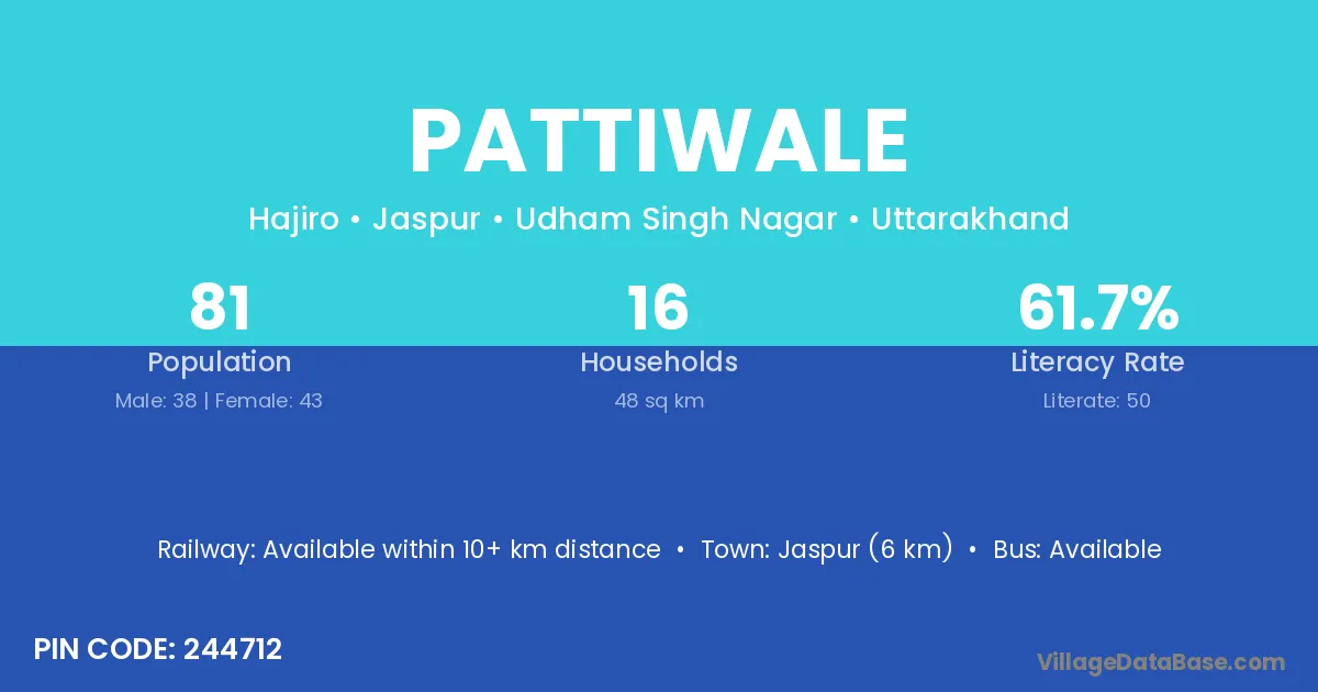 Jaspur (6 km) is the nearest town to Pattiwale village for major economic activities and is located approximately 6 km away.