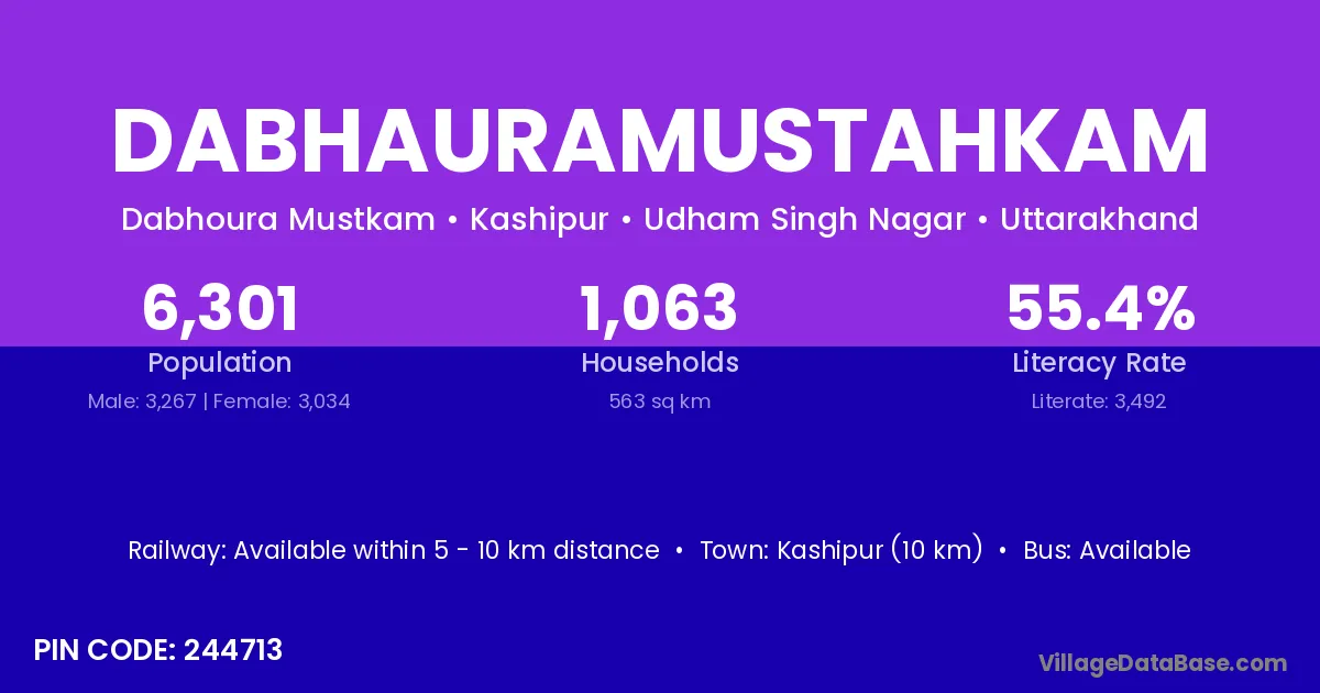 Kashipur (10 km) is the nearest town to Dabhauramustahkam village for major economic activities and is located approximately 10 km away.