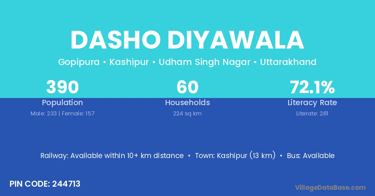 Kashipur (13 km) is the nearest town to Dasho Diyawala village for major economic activities and is located approximately 13 km away.
