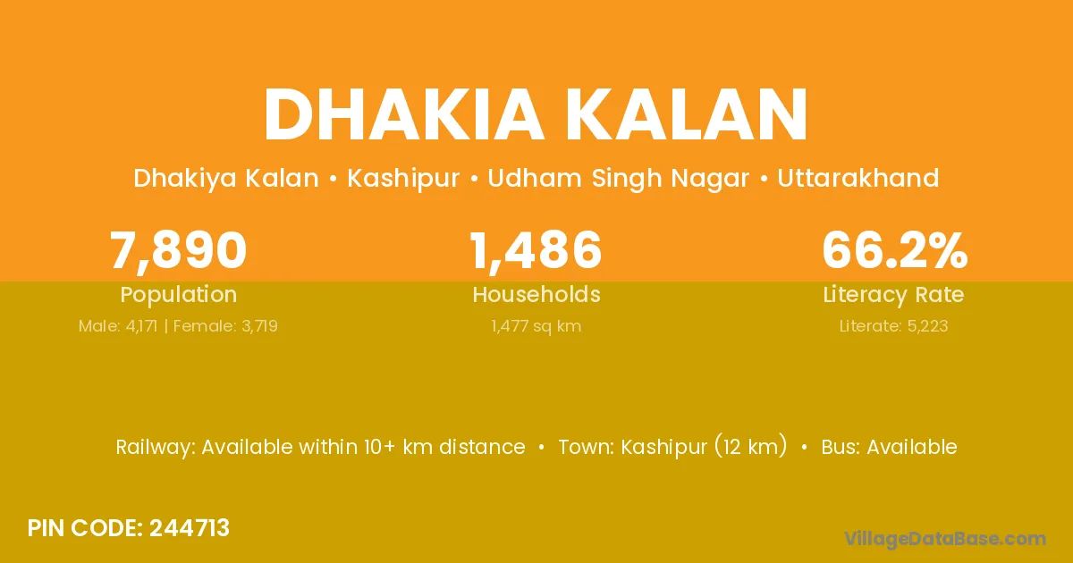 Kashipur (12 km) is the nearest town to Dhakia Kalan village for major economic activities and is located approximately 12 km away.