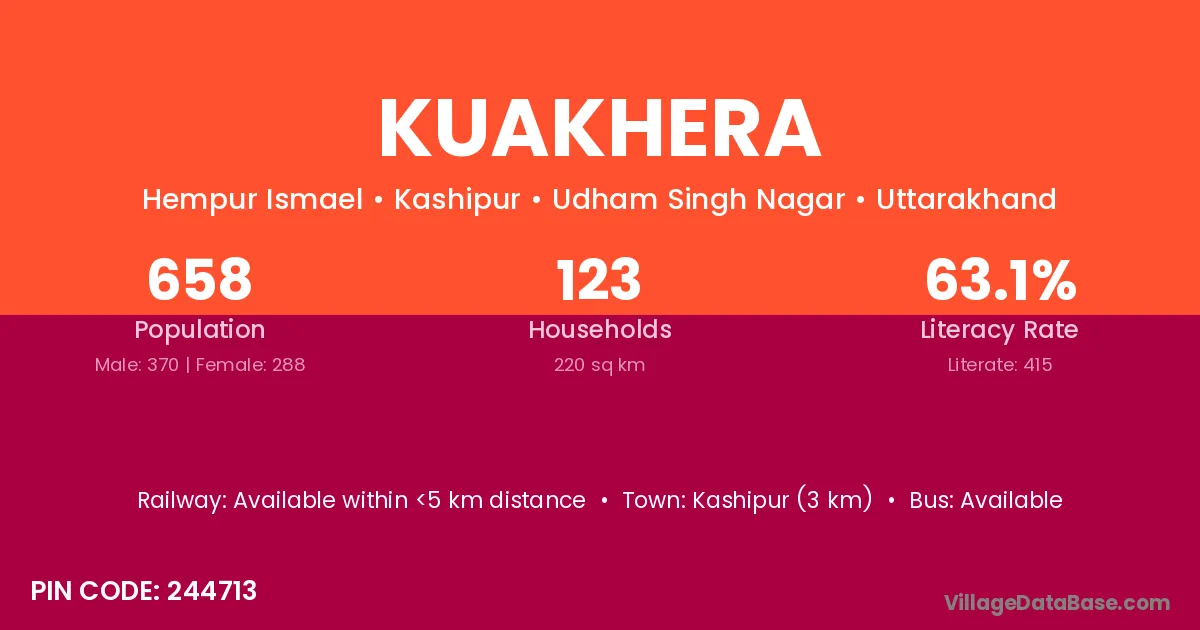 Kuakhera village has a total population of 658 people, of which 370 are males and 288 are females.